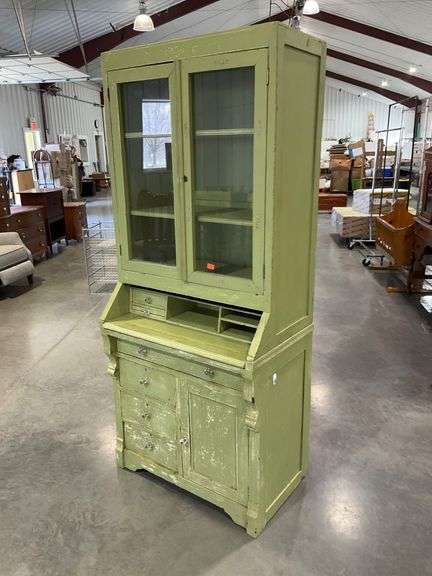 2-piece hutch measuring 32x20x75”. Features an upper section with glass-panel doors and interior shelving, a lower section with drawers, a cabinet, and cubbies. Painted green with glass knobs, exhibiting a distressed finish. Includes divided shelves in cabinet.