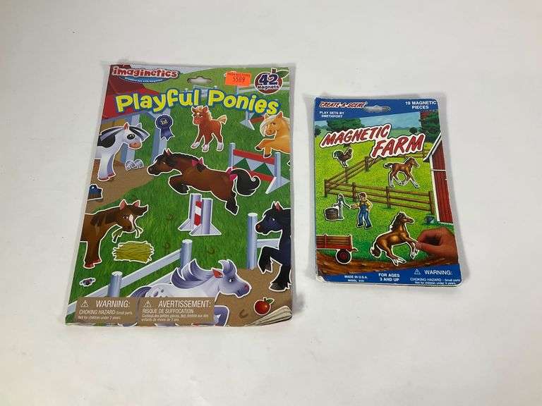Magnetic play sets by Imaginetics featuring 'Playful Ponies' with magnetic pieces and 'Magnetic Farm' with vibrant farm-themed magnets. Includes illustrated background boards for interactive play.