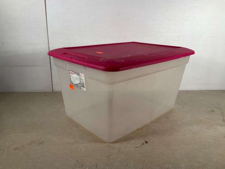 Sterilite plastic storage container with a 58-quart (55-liter) capacity. Features a clear body and a red lid with clasp-style handles for secure closure. Suitable for organizing and storing household items. Label and branding visible on side.