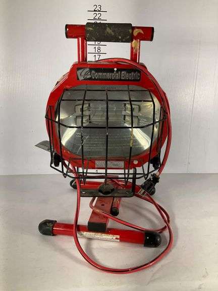 Commercial Electric brand red work light featuring an adjustable metal stand for positioning and a protective wire cage around the light housing. Includes integrated power cord and labeled operational instructions at the back. Marked as functional.