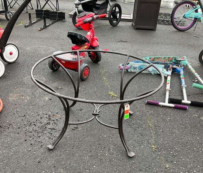 Metal table base featuring a round design with four curved legs and decorative center support. Designed to accommodate a round tabletop, not included. Diameter is 29 inches.