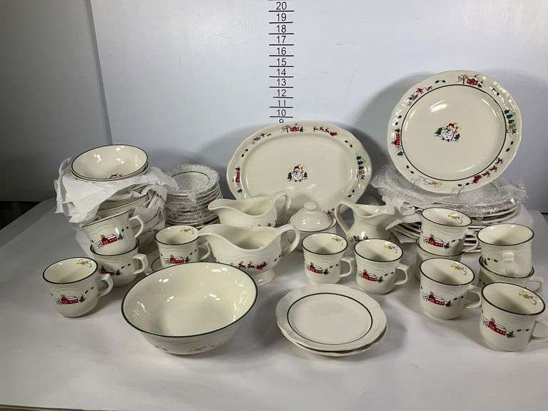 Pfaltzgraff dinnerware set featuring 57 pieces with a holiday theme. Designs include a snowman, barn, and holly accents. Set contains plates, bowls, cups, saucers, serving platters, and gravy boats. Green trim and colorful detailing included. All items bear the Pfaltzgraff mark. Includes clear tote no lid.