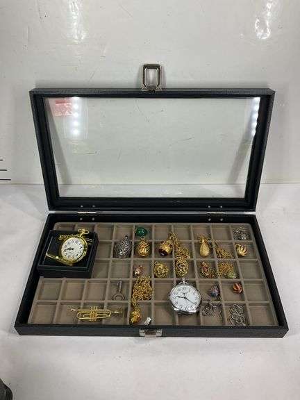 LOT 909 - 15in long Display box with jewelry to include two pocket watches both running, egg pendants/ necklaces, and skeleton key