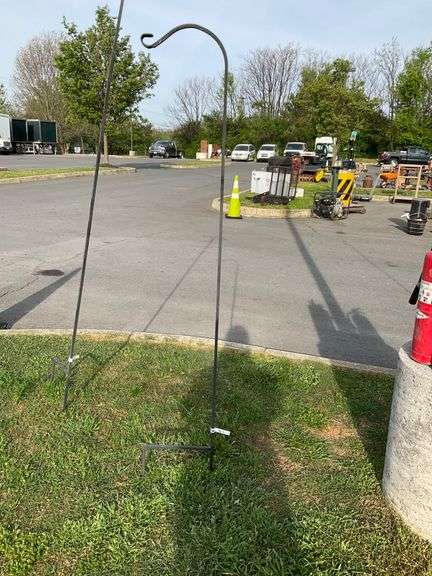 Black metal shepherd hook measuring 70 inches tall. Features a curved hook design and ground stakes for stability. Suitable for various outdoor applications, including hanging plants or decorations. Made of sturdy metal construction.