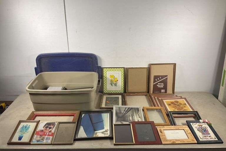 Picture frames featuring different sizes, styles, and materials, some with printed artwork or placeholders. Includes a plastic storage bin with a lid for organization. Frames vary in design, including wood, metallic, plastic, and decorative elements.