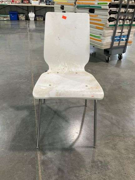 White chair featuring a molded seat and backrest with tubular metal legs. The surface shows visible dirt and marks, noted as needing a cleaning. Functional and utilitarian design suitable for various spaces.
