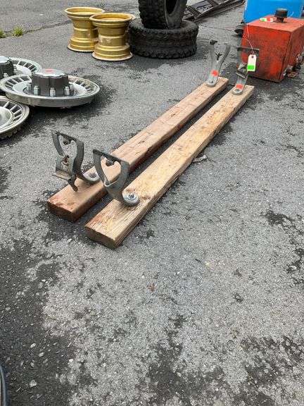 Two industrial brackets constructed from metal and secured to elongated wooden beams with bolts. Brackets feature a forked design at the top and appear suitable for mounting or holding applications. Sold as shown.