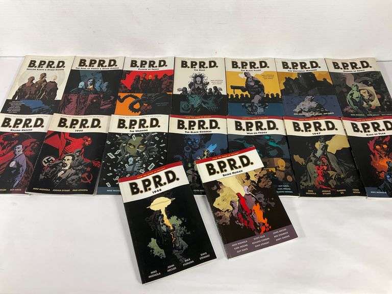 16 trade paperbacks from the ‘Hellboy B.P.R.D.’ comic series published by Dark Horse Comics. Includes titles such as ‘Hollow Earth & Other Stories,’ ‘1946,’ ‘Plague of Frogs,’ ‘The Warning,’ ‘The Black Goddess,’ and more. Authored by Mike Mignola and others. Warped from storage and smell musty as noted.