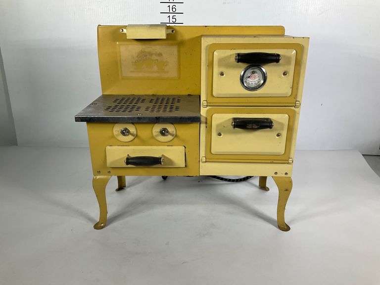 Empire miniature electric range featuring a yellow enamel finish, functional dials, a built-in thermometer, and multiple compartments including an oven and storage drawer. Includes original recipe booklet. Cord with vintage two-prong plug attached.