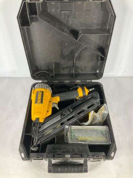 DeWalt pneumatic nail gun housed in a hard plastic carrying case. Includes visible accessory items such as nails in plastic packaging and a compartmentalized storage box. The case has a molded handle and secure latches.