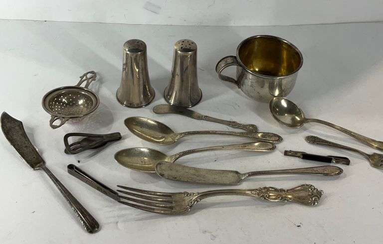 LOT 772 - Sterling silver items, 485grams- salt and pepper shakers, flatware, money clip etc
