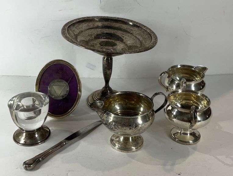 LOT 773 - Weighted sterling silver items, pedestal bowl, cracked picture frame, creamers, etc