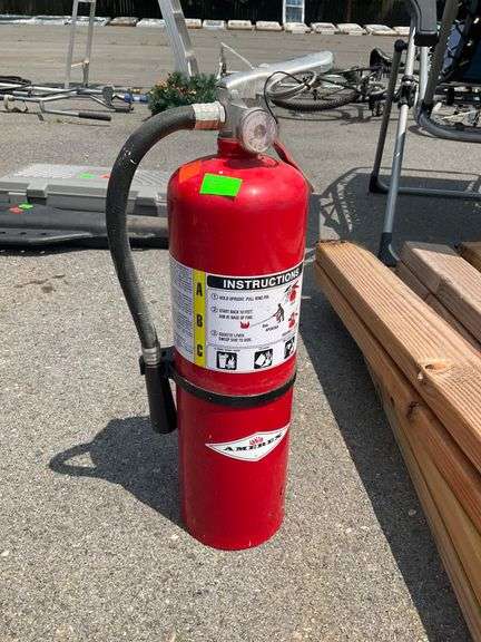 ABC-rated fire extinguisher with attached hose and instructional labeling. Red cylindrical design, 16 inches in height. Still retains some charge as noted. Constructed for use on Class A, B, and C fires.