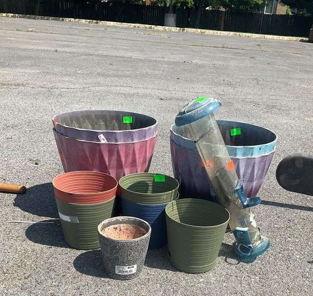 Plastic planters in various colors and designs, including some with pre-drilled holes. Includes one tubular bird feeder with multiple feeding ports. All items are pictured together outdoors.