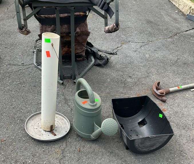 Gardening items including a green plastic watering can with rosette spout, a black plastic planter box, and a white cylindrical bird feeder base with metal tray. Items exhibit signs of outdoor exposure.
