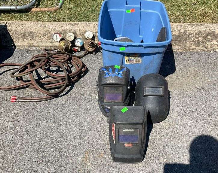 Includes three welding helmets, two brass pressure regulators marked 'Victor Equipment Co.', and hoses with brass fittings. Accessories are housed in a blue plastic storage bin. Items show visible wear.