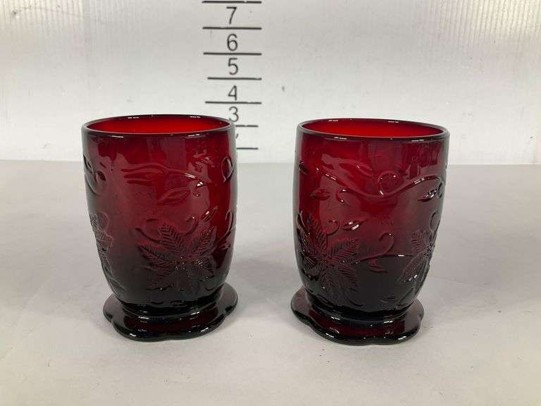 Two ruby red glass tumblers featuring a molded design of floral patterns and vine details. Each has a scalloped base and a glossy finish. Notable for their intricate detail and vibrant color contrast.