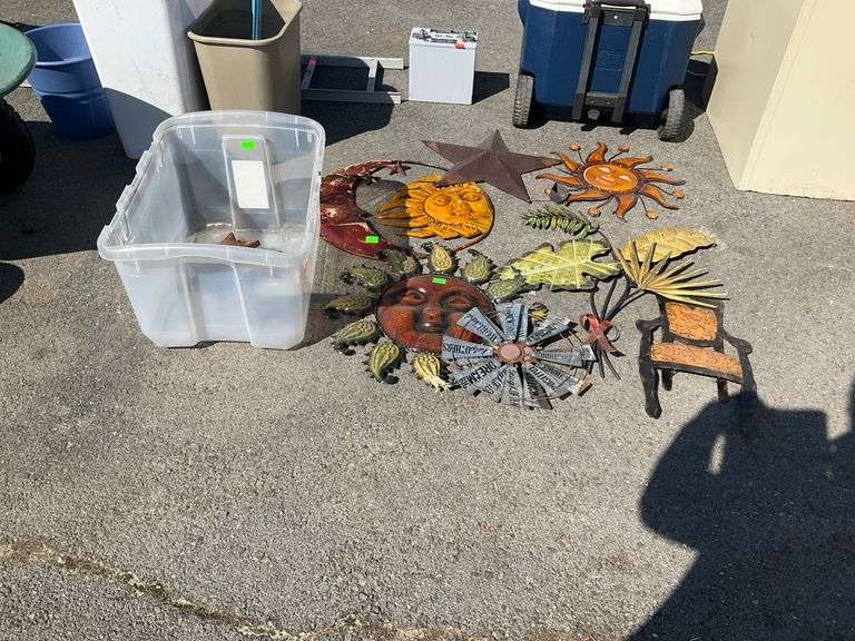 Plastic tote housing a variety of metal decorations, including sun, moon, leaf, star, and abstract designs. Items display intricate craftsmanship with assorted colors and patterns. Includes both free-standing and flat decorative items.