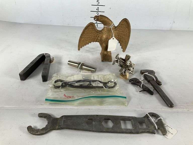 Grouping includes various metal tools such as wrenches, a lathe attachment, and clamps, along with a cast metal eagle figurine. Items appear to be a mix of utility and decorative objects.