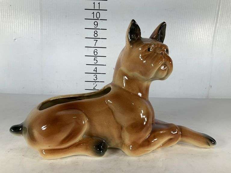 Ceramic planter featuring a reclining dog design with a glossy glaze finish. Features an open compartment on the back suitable for holding plants or decorative items. Notable details include pointed ears and a detailed facial expression. Estate of George R. Rotenberry.