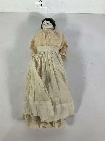 Porcelain-head doll featuring black painted hair with blue-painted eyes. Wearing a cream-colored fabric dress with layered detailing, soft cloth body, and stockings. Porcelain hands exhibit wear. Visible overall age-related characteristics.