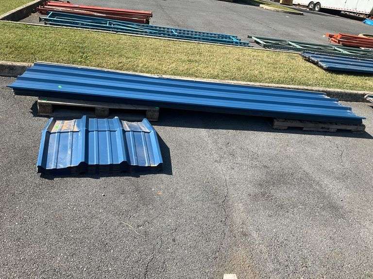 20 ribbed tin roof panels and 10 tin caps. Panels measure 12'11" in length and 36" in width. Designed with a ribbed texture, shown in blue finish. Caps are similarly styled to complement the panels. Items are photographed on pallets arranged for sale.