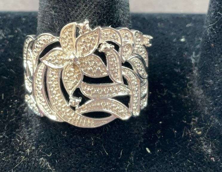 LOT 687 - Diamond accent floral platinum bond ring size 10