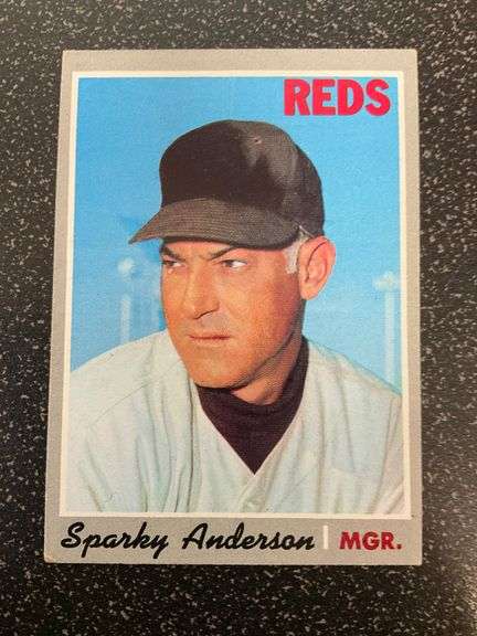 1970 Topps Sparky Anderson baseball card #181 featuring the Cincinnati Reds manager. The front includes an image of Anderson with 'Reds' lettering, and the reverse details his career highlights and managerial record.