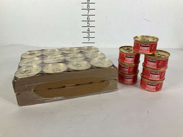 Kirkland Chunks in Gravy canned cat food featuring a salmon recipe. Includes a total of 24 metal cans of flavor unknown, each individually sealed. Cans displays a ‘Best if Used By’ date of January 22, 2028.