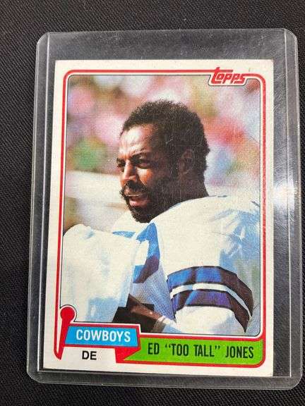1981 Topps football trading card featuring Ed 'Too Tall' Jones, defensive end for the Cowboys. Includes biographical details and career highlights on the back. Marked with 'NFLPA' and copyright 1981. Enclosed in a protective sleeve.