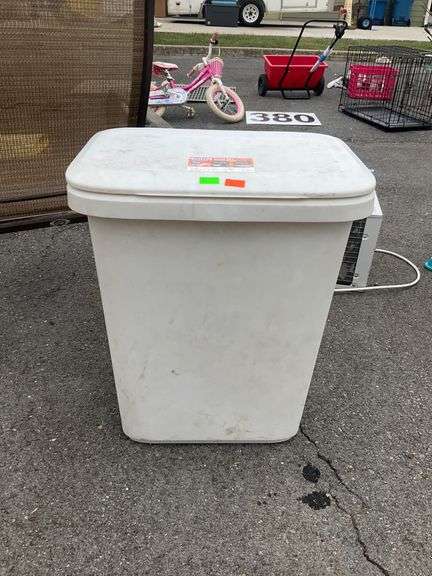Rectangular trash bin by Hefty, featuring a dual function design with an interior divider for separate compartments. Designed for use with two 13-gallon bags. Lid attached for secure closure.