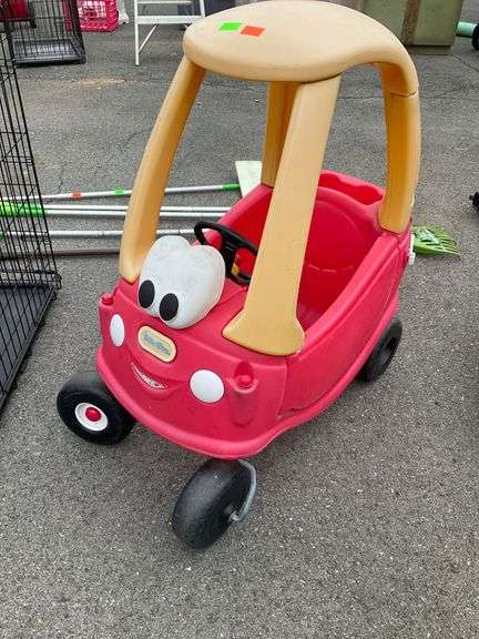 Child-sized ride-on toy car manufactured by Little Tikes. Features a red body and yellow roof, with black wheels and a steering wheel. Includes molded details such as smiling face on the front and rear storage area. Designed for manual operation.