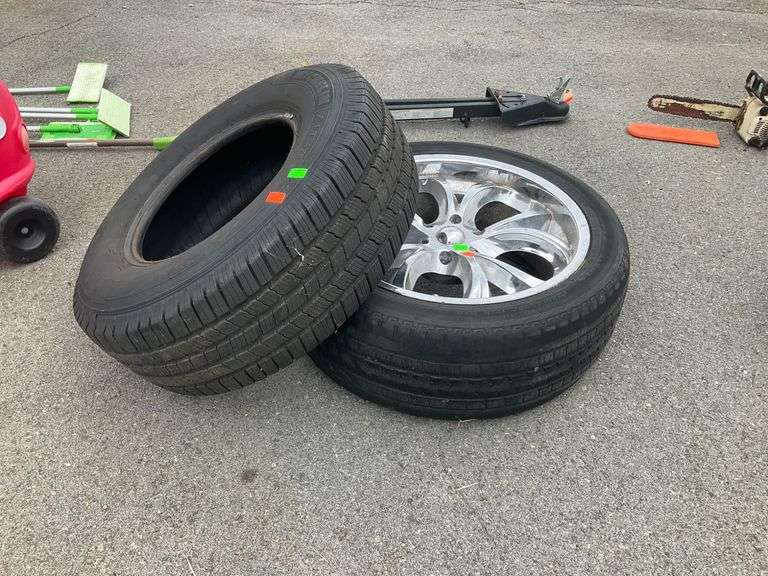 One Michelin tire with size 265/70R16 in lightly used condition, along with a Bridgestone tire sized 285/45R22 showing heavy wear. The Bridgestone tire is mounted on a metallic wheel in good condition. The tire of the Bridgestone is very worn.