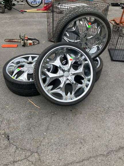 Four chrome wheels equipped with 255/30R24 97W XL tires. All tires show signs of prior use, and one wheel is bent. Features embossed center logos on each wheel. This lot is sold as-is.