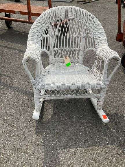 White wicker rocking chair with an arched backrest and woven seat. Designed for use by children or dolls. Visible wicker damage is present and may require restoration.