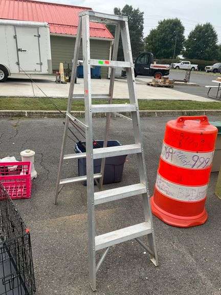 Aluminum step ladder measuring six feet in height. Features five steps, reinforcement supports at the base, and is designed for stability. Constructed of lightweight aluminum for ease of handling and durability.