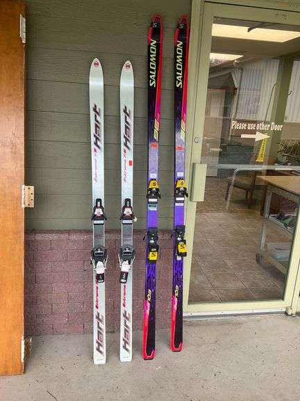 Includes one pair of Hart skis branded 'Extreme KS' equipped with Look bindings and one pair of Salomon skis featuring Equipe bindings. The Hart skis are predominantly white with red detailing, and the Salomon skis showcase a purple and red color scheme with distinctive branding.