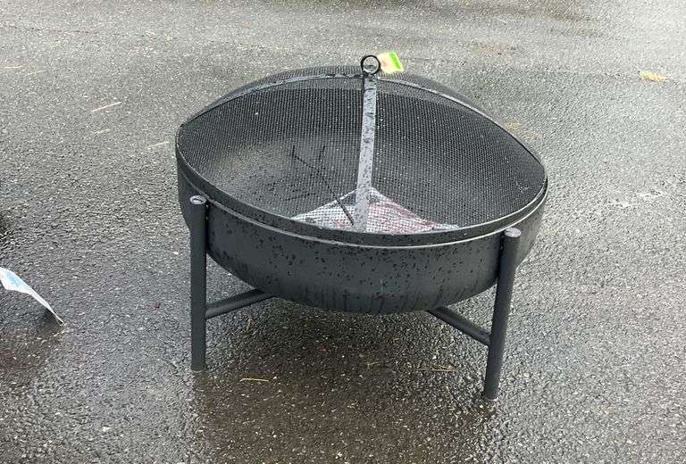 Round firepit featuring a mesh top and a 26-inch diameter. Includes a poker and a cover, as shown in the images. Supported by a simple four-leg base for stability. Designed for outdoor use.