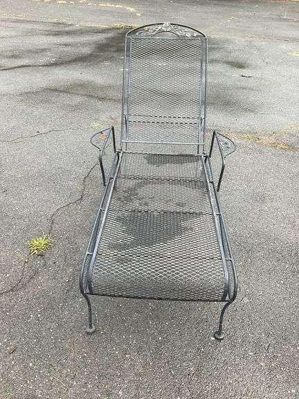 Chaise lounge featuring a mesh seat and backrest framed in metal with floral accents on the top backrest and side panels. Includes rear wheels for mobility and curved legs for stability. Constructed with a reclining backrest.