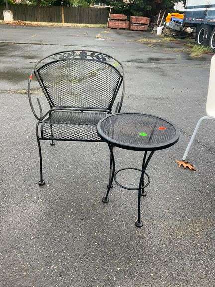 Chair features a floral accent along the backrest and a mesh seat and back. Side table has a mesh top and round design, measuring 16 inches in diameter. Both pieces are constructed from cast iron with matching design elements.