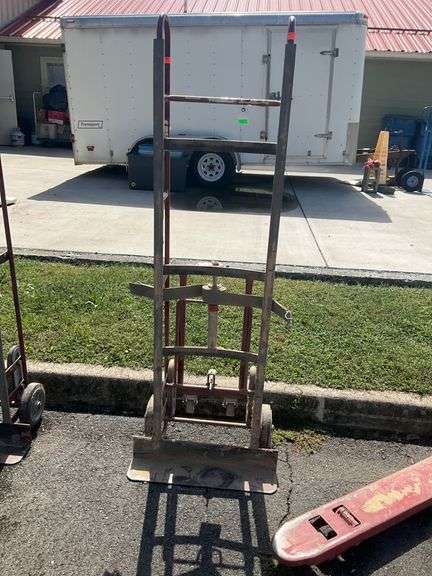 Utility hand truck featuring a durable metal frame with a red finish, integrated straps for securing loads, and a dual-wheel base for stability and mobility. Designed for heavy-duty tasks, with clear 'Made in U.S.A.' marking on the frame.