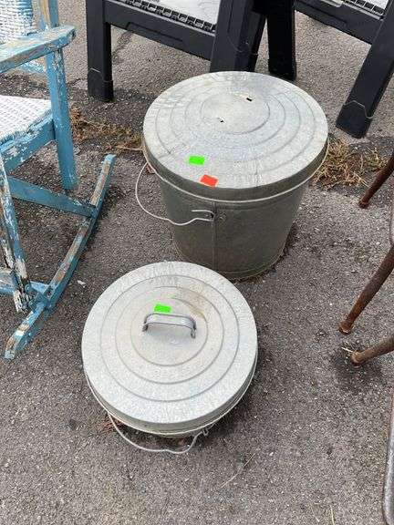 LOT 163 - Two Behrens Galvanized Metal Buckets with Lids 11in and 16in tall, largest without handle on lid