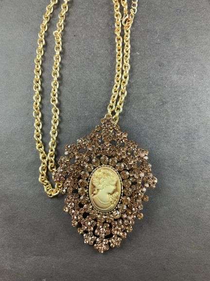 LOT 686 - Cameo and champagne Austrian crystal goldtone 24-26in brooch / pendant necklace