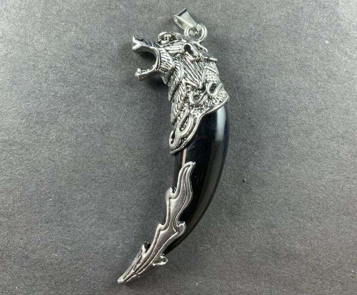 LOT 678 - Stainless faux black jade wolf tooth pendant