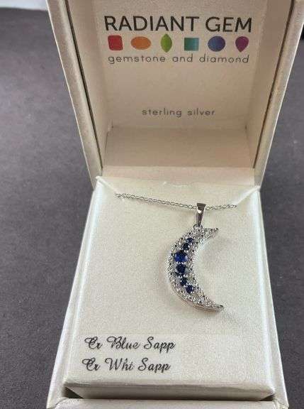 LOT 608 - Sterling silver diamond accent blue/white sapphire moon necklace radiant gem