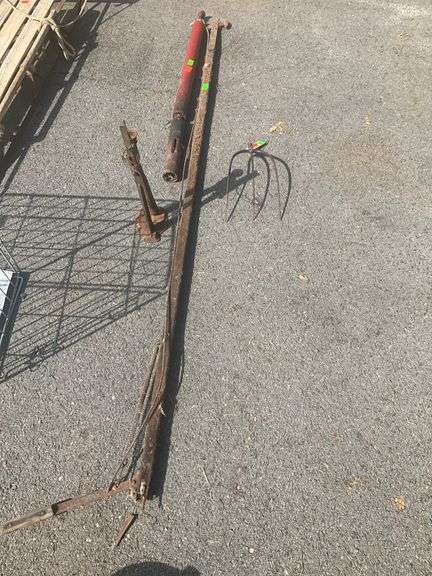 Metal parts and implements, including a red-painted hydraulic piece, a four-tine fork, a metal jack, and other miscellaneous components. Items exhibit wear and rust associated with use.