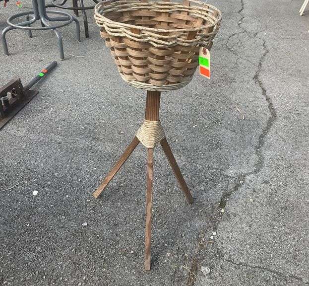 Tripod plant stand featuring a woven basket design with an 11-inch opening. The stand is supported by three legs, and the woven material wraps partially around the legs. Measures approximately 27 inches in height. Some restoration is needed for item.