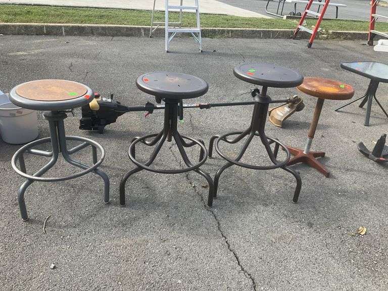 Four metal barstools featuring round seats with varying finishes and wear. Each stool has a unique base design, including tripod and circular frames, and some include integrated footrests. Notable variations in seat materials and finishes are present. Rust is evident on barstools.