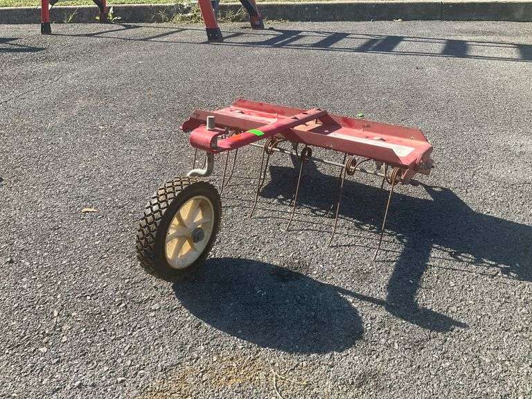 Snapper brand thatcherizer for attachment to compatible lawn equipment. Designed with a 20-inch clearing width, metal tines, and a single pneumatic wheel for operation. Features include a red-finished metal frame with mounting brackets and labeled model plate.