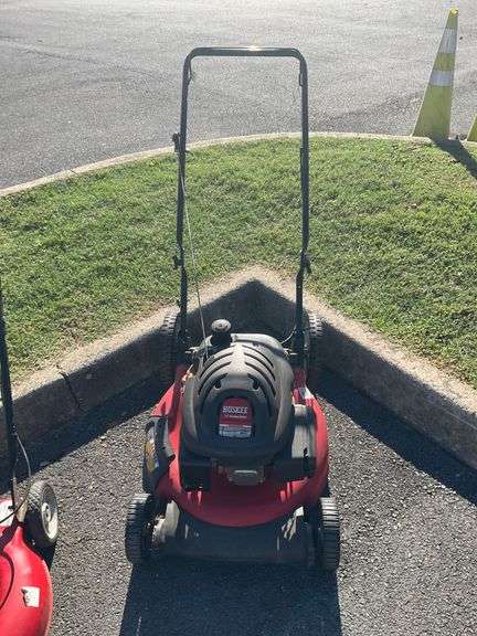 Huskee push lawn mower featuring a 21-inch cutting width and a Briggs & Stratton engine. Equipped with an adjustable handle and manual drive. Operates as should. Includes rear-discharge capabilities and a durable red and black housing.